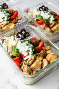 For quicker prep, use rotisserie chicken. Swap quinoa with brown rice, barley, bulgur, couscous, or roasted sweet potato. For low-carb, use cauliflower or broccoli rice. Add chickpeas or edamame for extra fiber. Keep tzatziki separate for meal prep; refrigerate bowls 3–4 days.