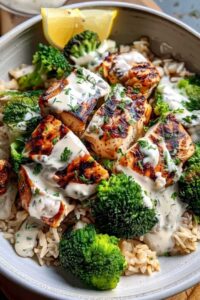 - Assemble each bowl with brown rice, broccoli, and sliced chicken. Drizzle with creamy garlic sauce and garnish with parsley if desired.