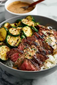 - Build your bowls: Start with cooked rice or mashed potatoes as the base. Layer grilled zucchini on top, add sliced steak, and drizzle generously with creamy herb sauce.