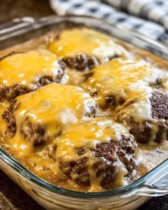 - In a baking dish, layer the sliced potatoes and onions, then place the browned patties on top. Pour the gravy over everything and sprinkle with cheddar cheese.