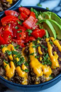 - Assemble bowls: start with lettuce base, add about 4 ounces of seasoned beef, then layer tomatoes, pickles, onion, and cheese.