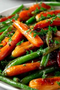 Choose firm, vibrant carrots for the best flavor. Fresh or frozen green beans work well - thaw and pat dry if using frozen. Local honey adds a unique floral note. For vegan option, substitute maple syrup for honey. Don't overcrowd the baking sheet. Use freshly ground spices for best results. If vegetables brown too quickly, reduce oven temperature by 25°F. Each serving is approximately 1 cup of glazed vegetables.