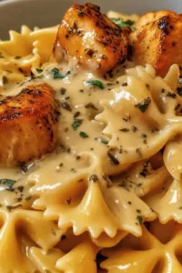- Add the drained pasta to the skillet with the creamy chicken sauce. Toss well to ensure every piece of pasta is fully coated with sauce.