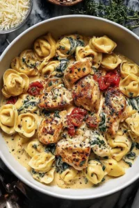 Use a large 12-inch skillet for best results. Fresh tortellini provides best texture. Pat chicken dry before cooking for better browning. Watch garlic closely to prevent burning. Save pasta water before draining, it helps create silky sauce. Internal temperature of chicken should reach 165°F. Store leftovers in airtight container in refrigerator for up to 3 days. Reheat gently on stovetop over low heat, adding a splash of cream to restore silky texture. Not recommended for freezing as cream sauce may separate.