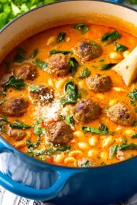 - Bring soup to a gentle boil. Add meatballs and dry pasta. Return to a gentle boil and cook until pasta is al dente (8 minutes for ditalini, 9 minutes for small shells, or 7 minutes for orzo).