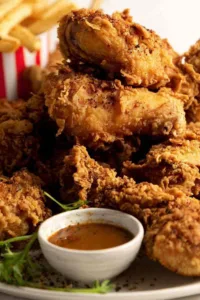 - Working in batches of 2 to 3 pieces, dredge each piece in the remaining marinade then press firmly into the flour mixture on all sides. Never coat all chicken at once.