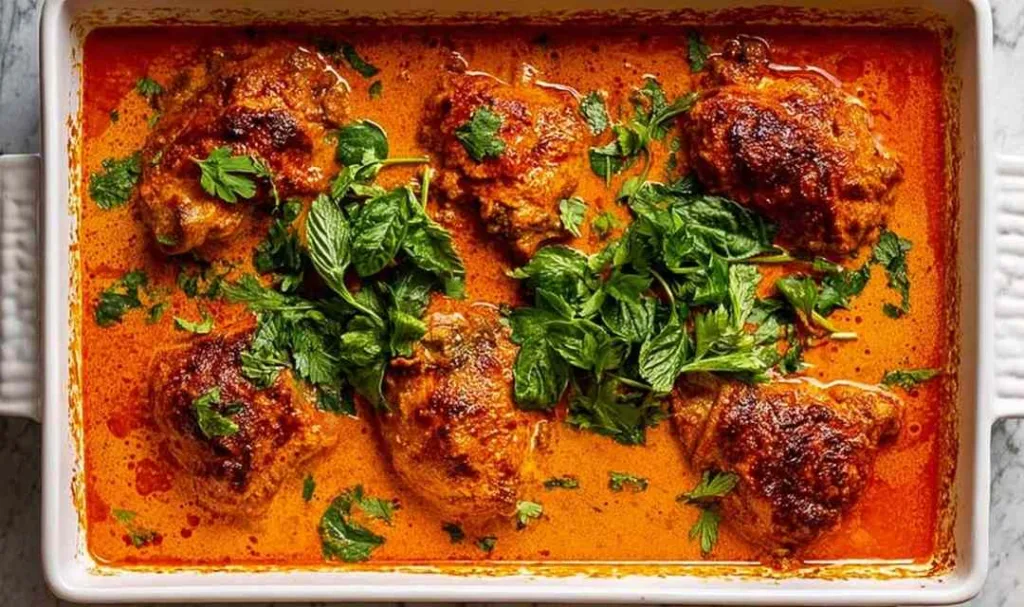 Growing up on my grandmother’s farm in Indiana, I learned early that the oven is the most patient cook in any kitchen. On cold October Sundays, grandma would slide a dish into the oven, wipe her hands on her apron, and sit down to visit while dinner took care of itself. That wisdom lives in this recipe. You coat the chicken in a warm spiced yogurt marinade, stir together a simple tomato cream sauce right in the baking dish, nestle the chicken in, and let the oven do every bit of the heavy lifting. Forty-five minutes later, the sauce has thickened and deepened into something that tastes like it simmered for hours. Time to get your baking dish ready.