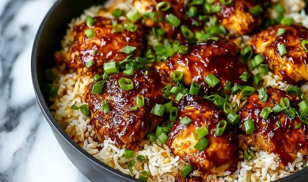 One-pan Honey BBQ Chicken Rice with glossy sauce and green onion garnish in cast iron skillet