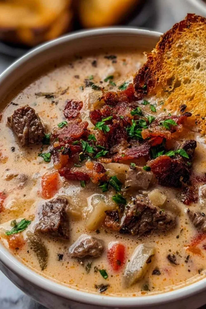 One-Pot Philly Cheesesteak Soup with Bacon and Cheesy Toast