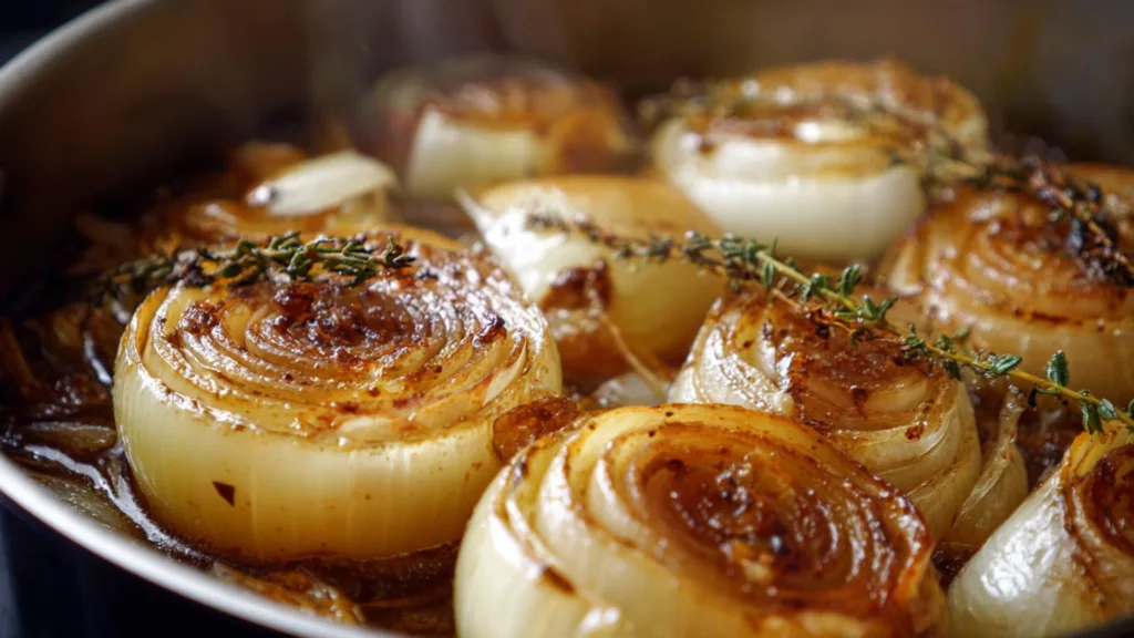 There is something almost magical about what a low, patient simmer does to a whole onion. Back on my grandmother’s farm, she would tuck onions around a Sunday roast and let the oven do the work. She always said the onion was the most honest vegetable in the kitchen because it never pretended to be anything other than itself. This stovetop version carries that same spirit. Butter melts into broth, white wine adds a gentle brightness, fresh thyme weaves through every layer, and the onion just opens up. Tender. Sweet. Deeply savory. Your kitchen is about to smell incredible.