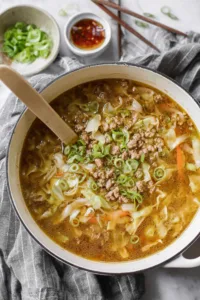 I still remember the first time I made this soup on a chilly October evening when my grandson called asking for “something like egg rolls but healthier.” Growing up in the Midwest, we didn’t have much Asian food, but I’ve learned over the years that the best comfort food borrows flavors from everywhere. This soup has become my go-to when someone’s feeling under the weather or when I want something filling without all the fuss of wrapping and frying. The cabbage wilts down into silky ribbons, the ginger warms you from the inside out, and that combination of coconut aminos and rice vinegar creates the perfect savory-tangy balance. Your kitchen’s about to smell incredible.