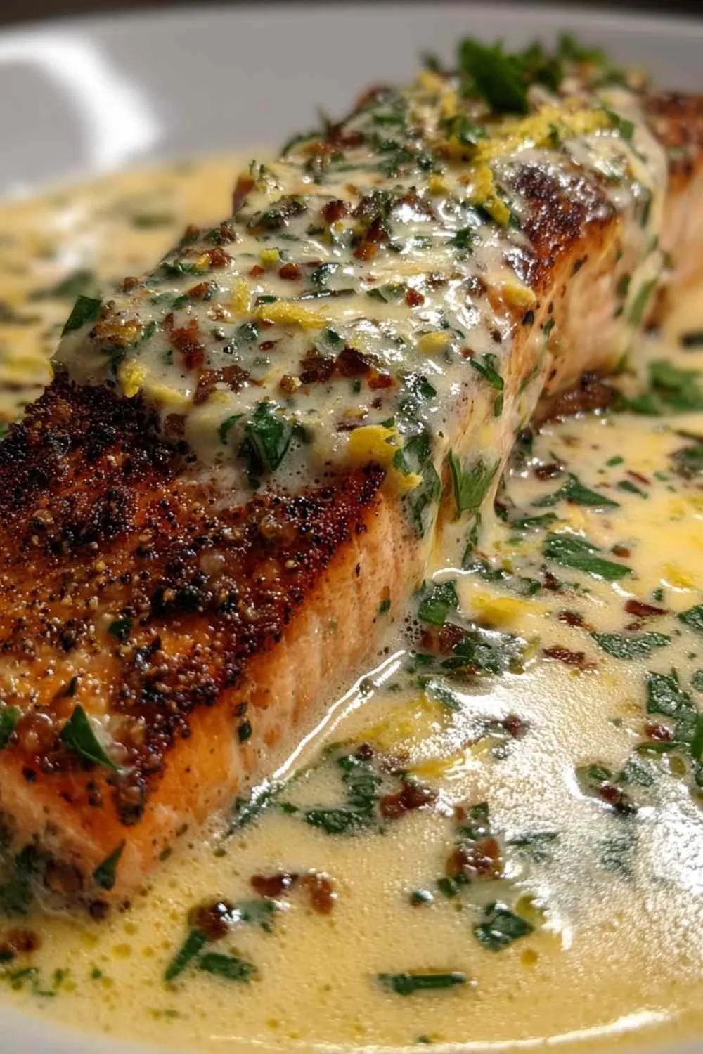 - Plate the salmon immediately, drizzle generously with the warm lemon garlic cream sauce, sprinkle with fresh parsley, and garnish with lemon slices if desired.