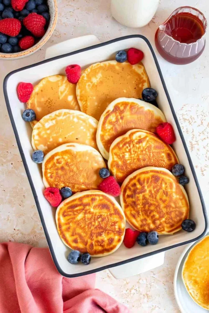 Betty’s freezing method works well because these pancakes maintain their fluffy texture even after freezing. Let them cool completely, then stack them in an airtight container with parchment paper between layers. They’ll keep in the freezer for up to 3 months, ready whenever you need a quick protein-packed breakfast.