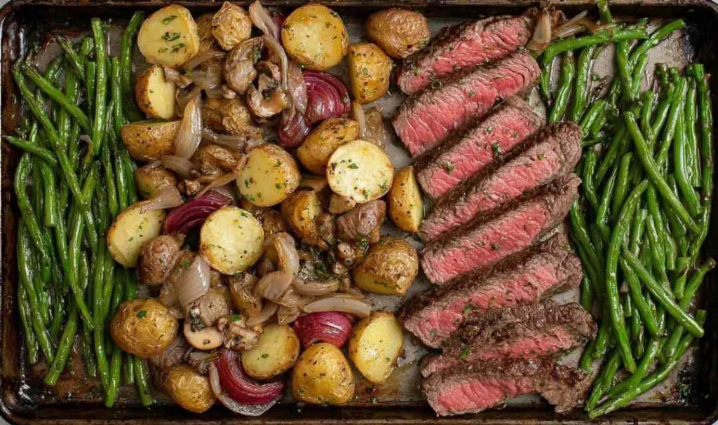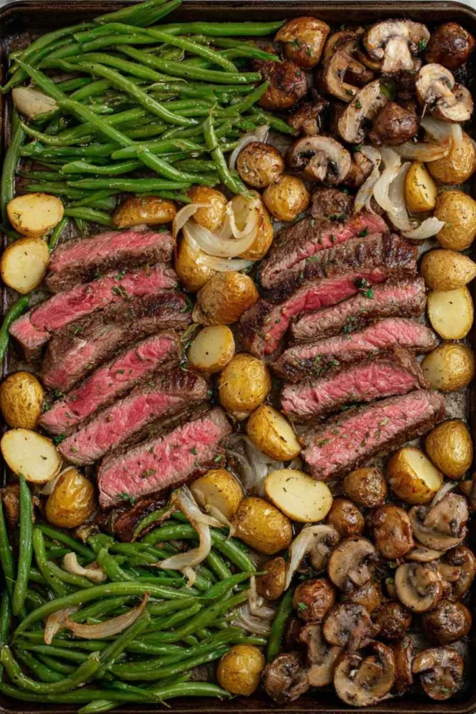 Step 5. I’ve found that letting the sheet pan rest for 3-5 minutes after removing it from the oven allows the steak juices to redistribute, ensuring every bite is tender and flavorful.