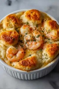 Garlic: Fresh garlic infuses the entire dish with aromatic warmth, complementing both the seafood filling and the savory biscuit topping.