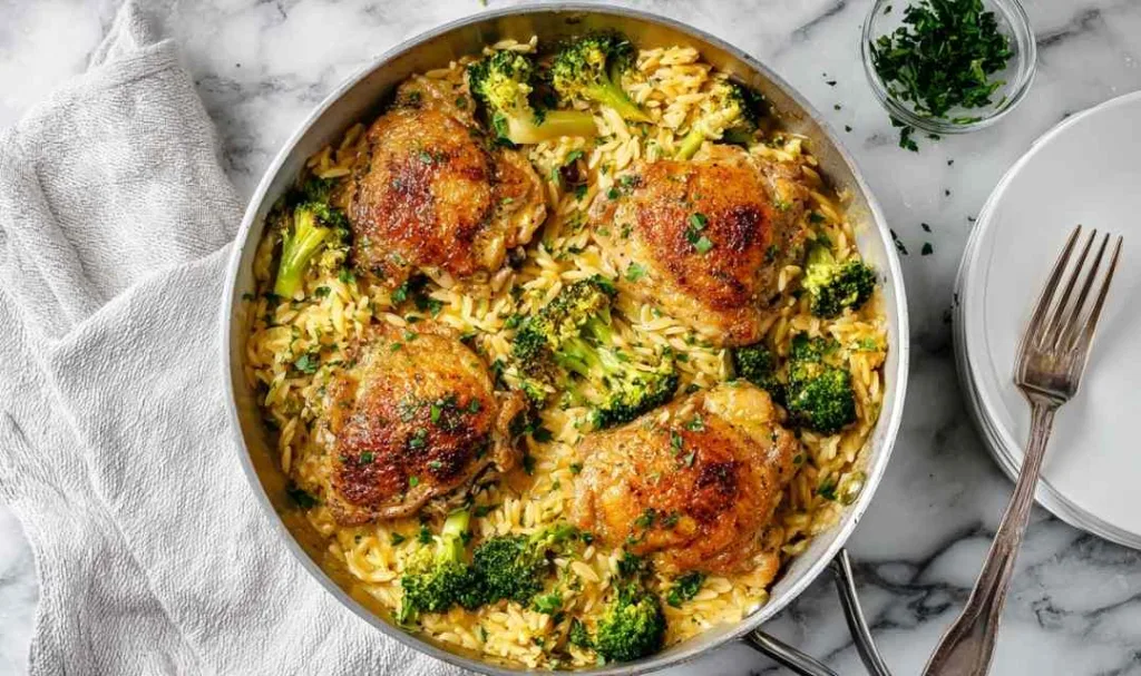 Why Skillet Chicken Thighs with Broccoli Cheddar Orzo Belongs in Your Recipe Box