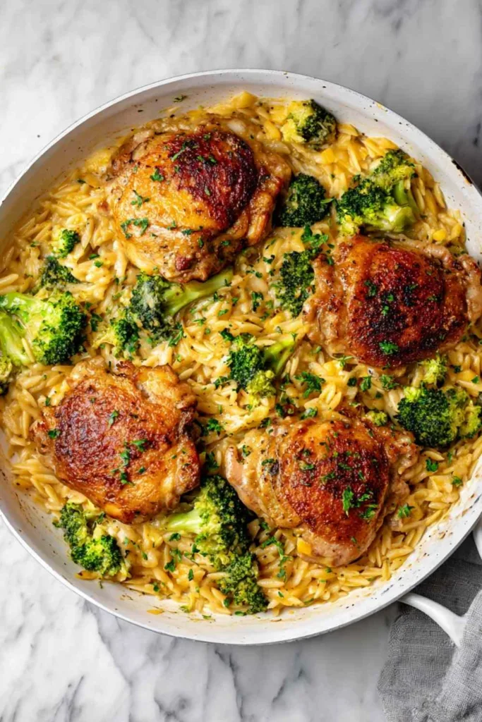 Skillet Chicken Thighs with Broccoli Cheddar Orzo
