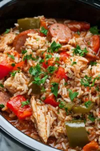 I’ll never forget the first time I tasted authentic jambalaya—it was at a church potluck where a neighbor from New Orleans brought her family recipe. The mix of smoky sausage, tender chicken, and those vibrant Cajun spices dancing together in every bite completely won me over. I spent years trying to recreate that magic in my own kitchen, but between work and raising three kids, I rarely had time for the traditional stovetop method that requires constant stirring and attention. That’s when I discovered the beauty of making Slow Cooker Chicken Jambalaya—just toss everything in the crockpot in the morning, and come home to a kitchen filled with the incredible aroma of garlic, peppers, and Cajun spices. The chicken stays perfectly tender, the sausage infuses everything with smoky richness, and the flavors meld together in a way that makes it taste even better than the original. Your kitchen’s about to smell incredible!
