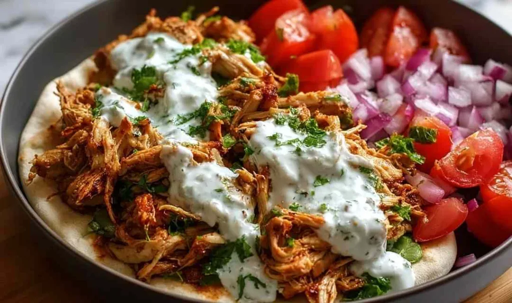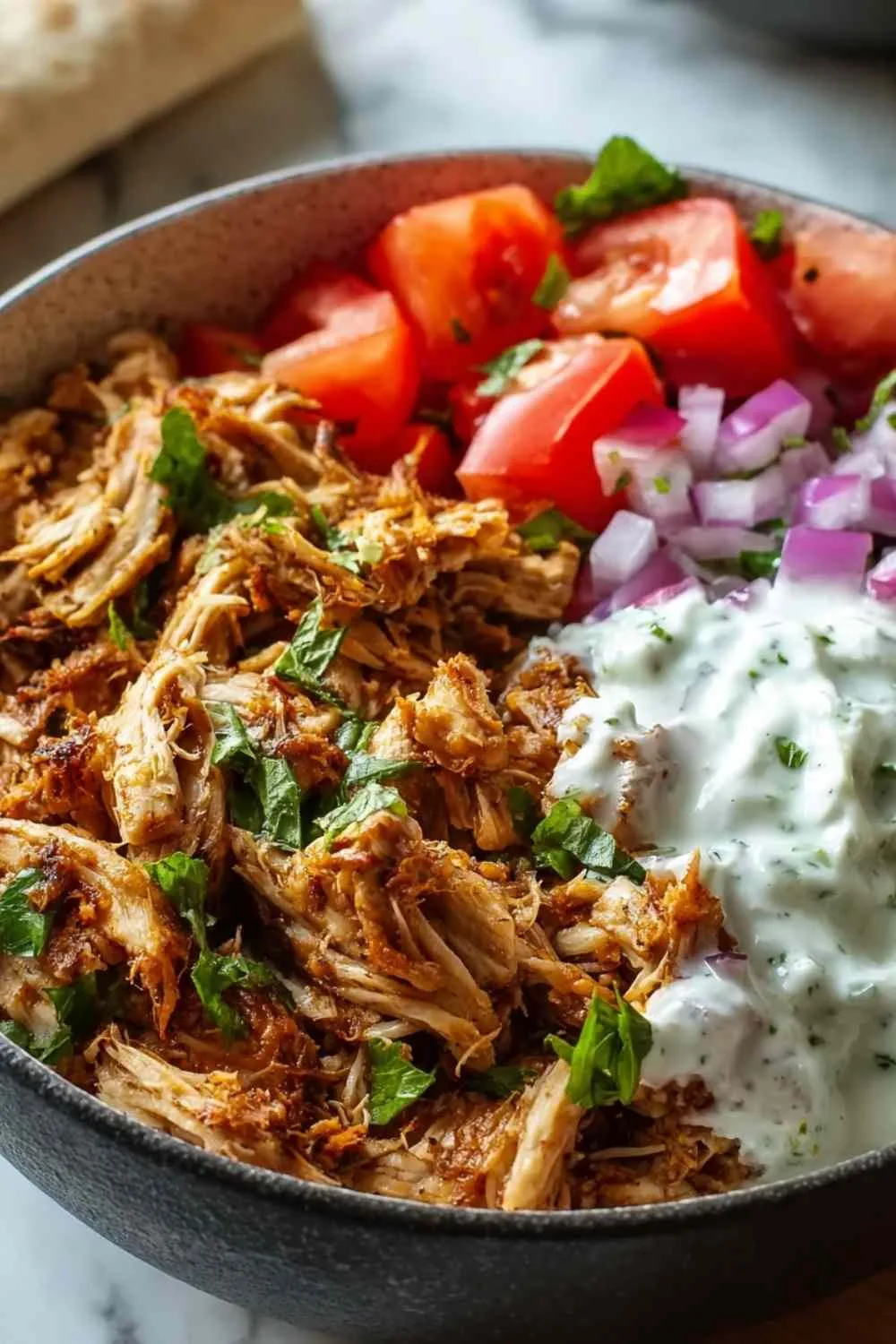 Step 7. Serve your slow cooker chicken shawarma in warm pita bread or over fluffy rice, topped with fresh parsley and a generous drizzle of yogurt or tahini sauce.