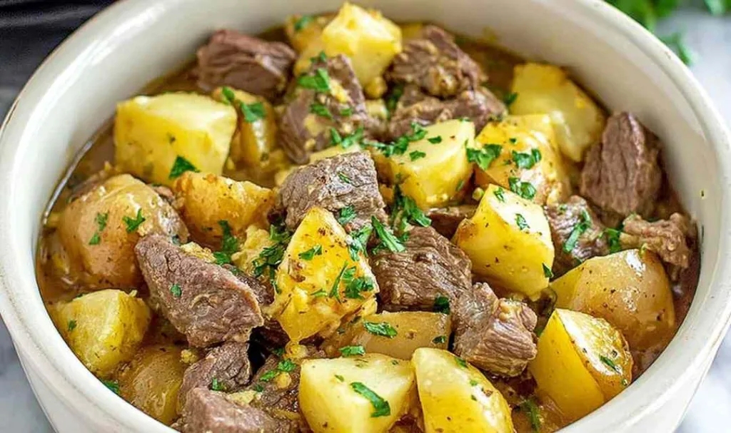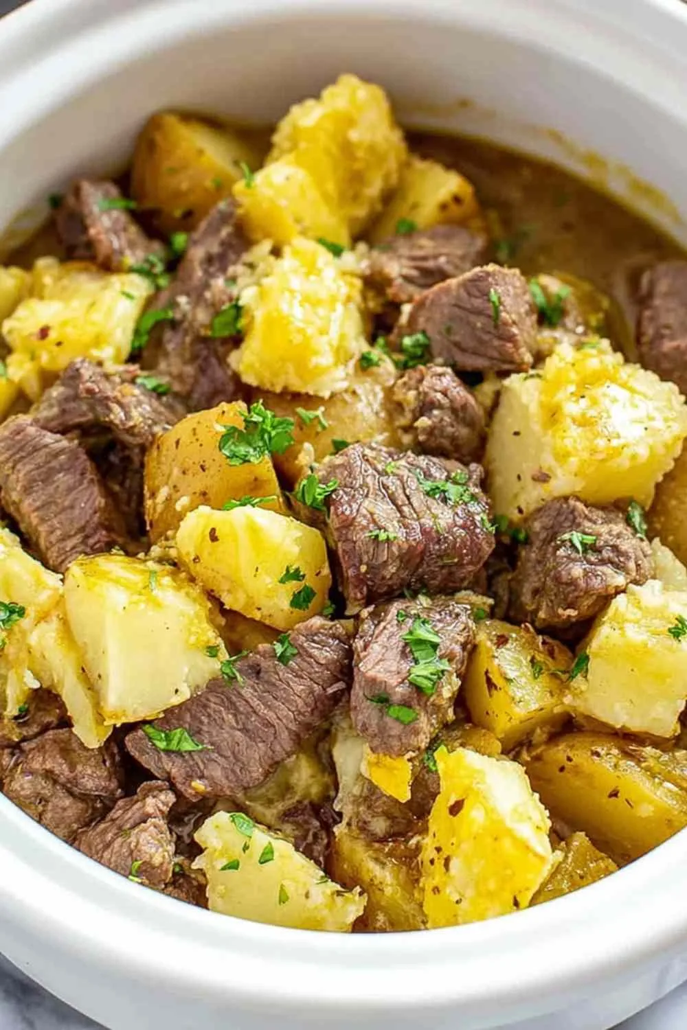 Step 10. Serve hot directly from the slow cooker, scooping down through all the layers so each portion gets steak, potatoes, and that incredible cheesy sauce.