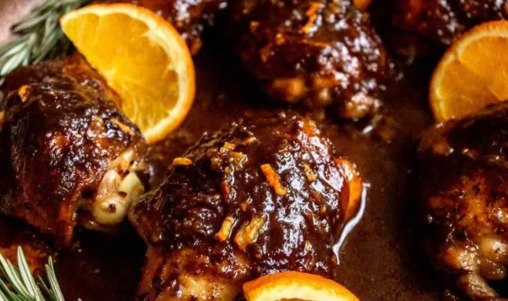 Step 7 – Final glaze and serve: Just before plating, give every piece one final generous baste. Arrange leafy greens on a large platter, pile the chicken on top, and garnish with orange slices and zest curls.