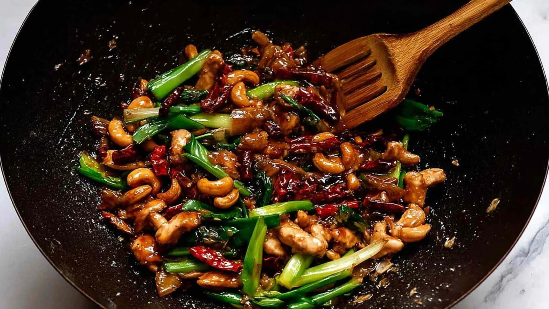 Step 2. Toast the cashews. Heat your oil over medium heat in a wok or large skillet. Add the raw cashews and cook for about 5 minutes, stirring occasionally, until they turn a deep golden brown and are fully crunchy. Remove them with a slotted spoon and set aside, leaving the oil in the pan. Under-toasted cashews lack that nutty richness, so patience here really pays off.