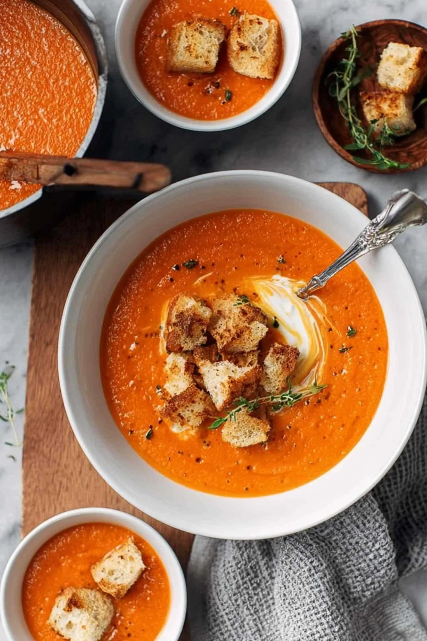 Can I make this creamy tomato soup ahead of time? Betty’s solution is making the soup up to 3 days in advance and storing it in the refrigerator – the flavors actually improve overnight, and you can make the grilled cheese croutons fresh when ready to serve.