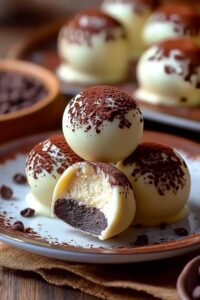 - Lightly sweetened whipped cream – A small dollop on the side adds an extra layer of indulgence while echoing the creamy mascarpone filling inside each truffle.