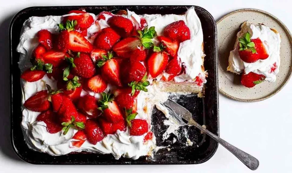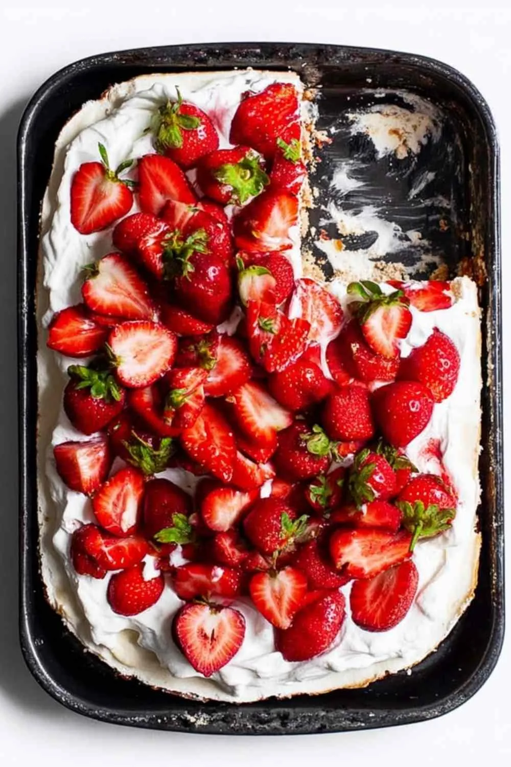 - Spread whipped cream evenly over chilled cake and top with fresh sliced strawberries.
